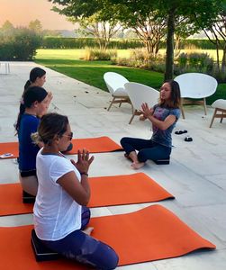 Erinn leads Vanessa and riders in a sunrise equestiOM Mat session to prep for a full day of showing and competition.